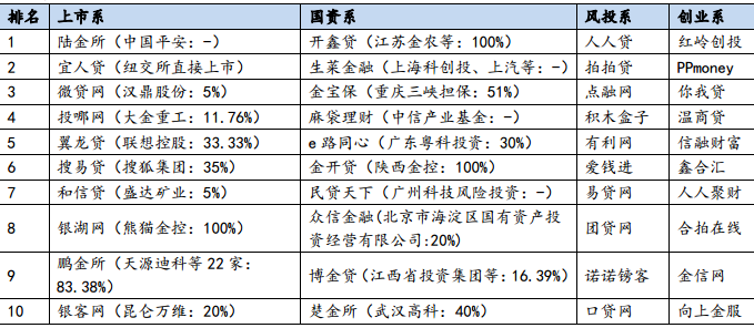 日前,网贷之家发布前十大上市系P2P平台,分别为陆金所(中国平安)、宜人贷(纽交所直接上市)、微贷网(汉鼎股份占股5%)、投哪网(大金重工占股11.76%)、翼龙贷(联想控股占股33.33%)、搜易贷(搜狐集团占股35%)、和信贷(盛达矿业占股5%)、银湖网(熊猫金控持股100%)、鹏金所(天源迪科等22家合计持股83.38%)、银客网(昆仑万维占股20%)。
