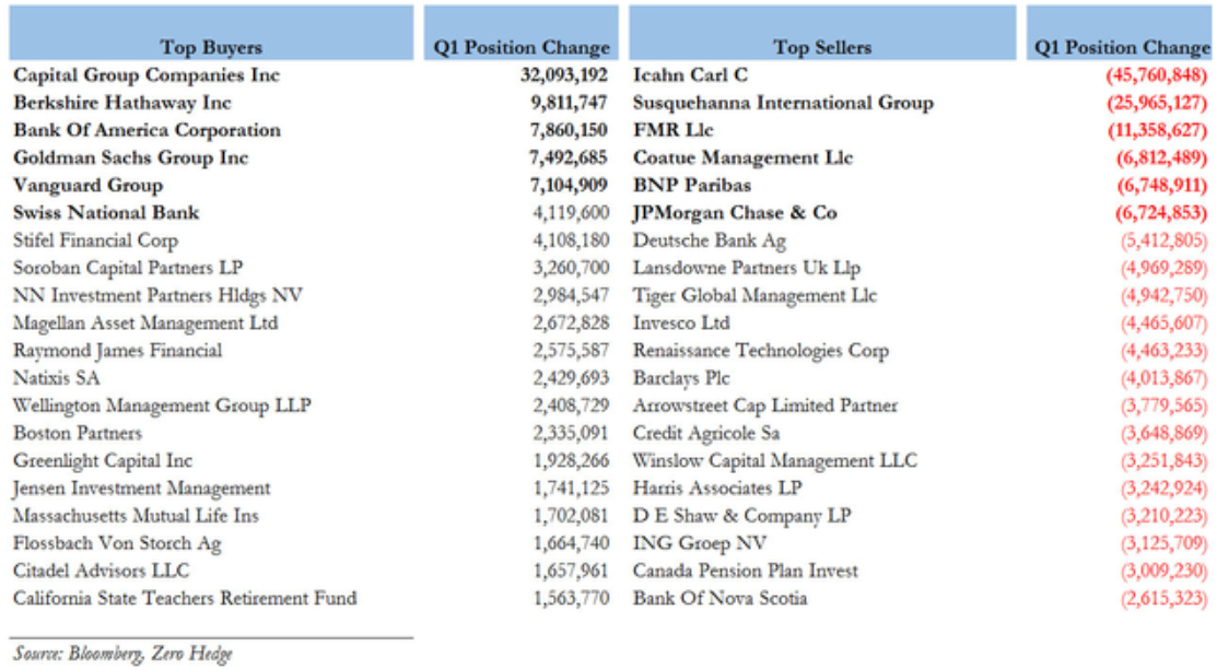 数据显示,伯克希尔一季度除了大举买入苹果以外,David Tepper的基金阿帕卢萨资产管理公司还购入陷入困境的制药公司Valeant共94.5万股股票,今年一季度期间所持市值约为24.8亿美元。根据文件内容,Tepper大举出手,于一季度购入160万股Facebook,以及690万股美国银行。