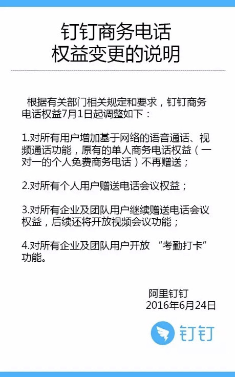 钉钉在公告中提到,从7月1日起,取消一对一的免费单人商务电话权益。作为补偿,对所有用户增加基于网络的语音通话、视频通话功能。对所有个人用户赠送电话会议权益,对所有企业及团队用户继续赠送电话会议权益。